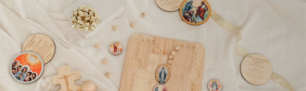 Our wooden products are heirloom quality additions to any home altar or prayer corner! Learn the prayers and mysteries of the rosary & keep your hands busy while you pray.