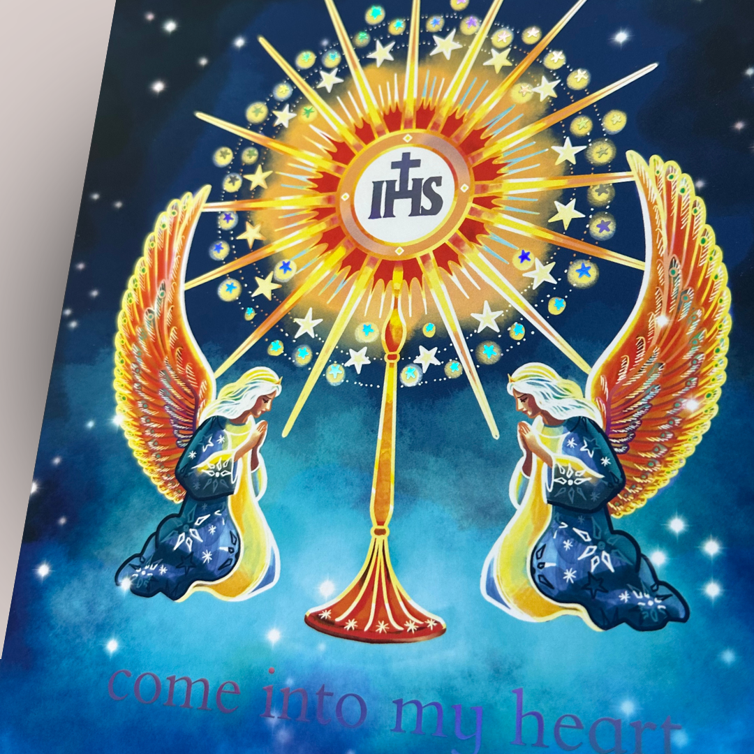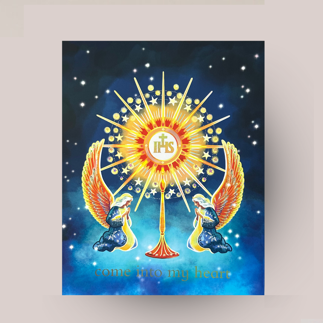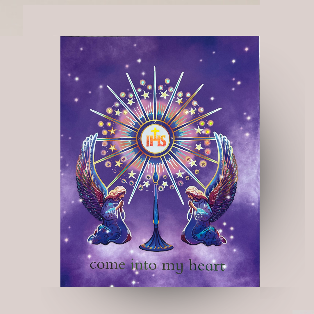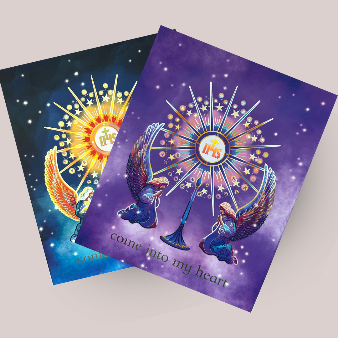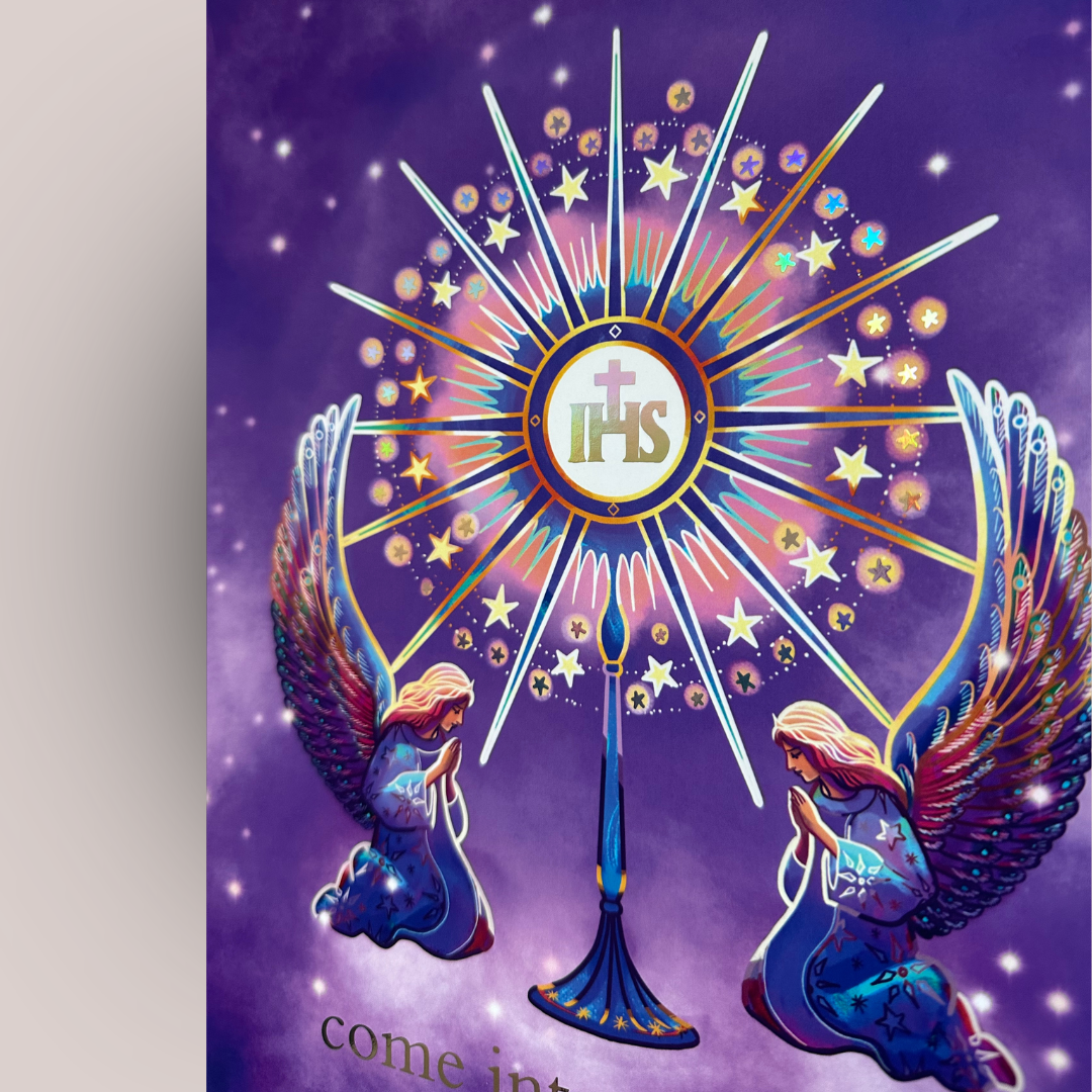 This Monstrance Print (8”x10”) features vibrant artwork in blue or purple, finished with reflective foil details that highlight the beauty of the Eucharist.