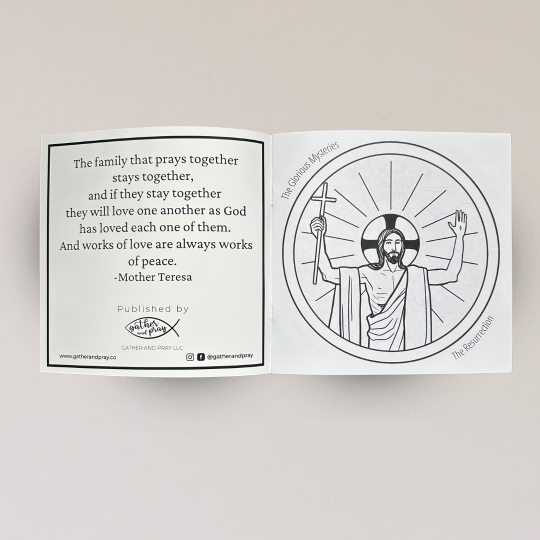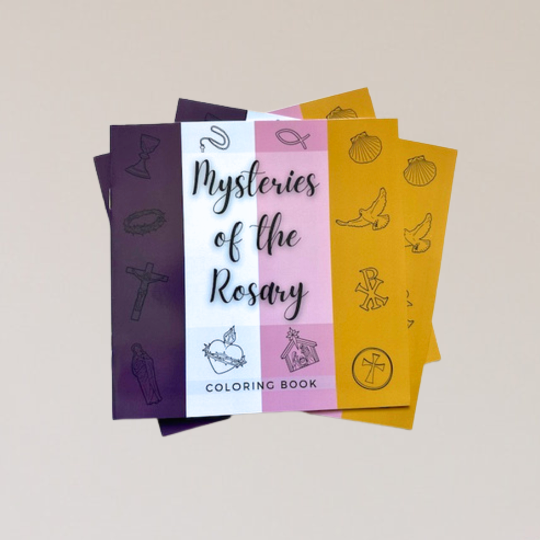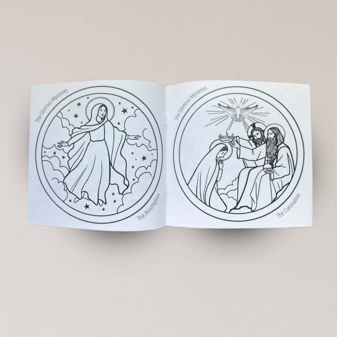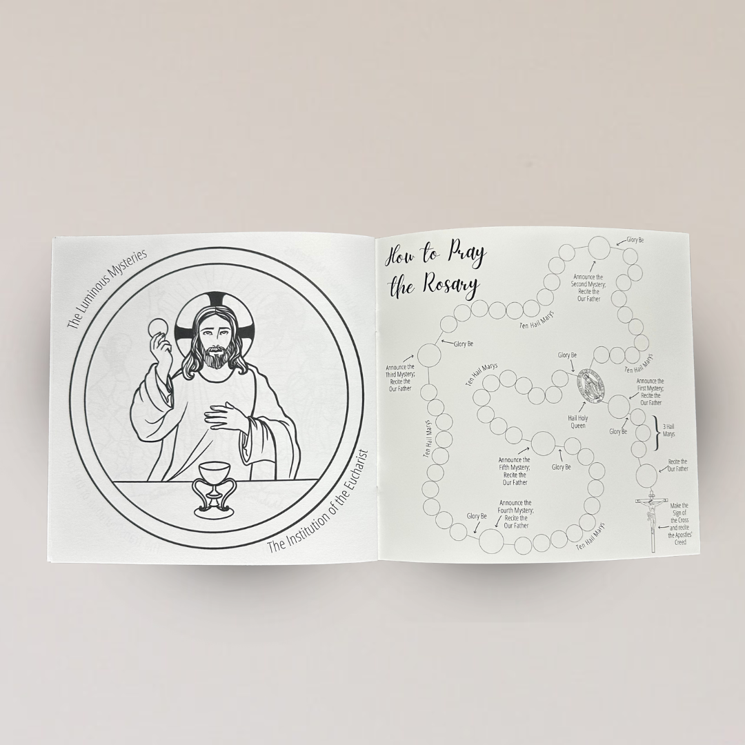 Each book includes 20 colorable pages covering the Joyful, Sorrowful, Luminous, and Glorious Mysteries, with easy instructions on how to pray the Rosary on the back.