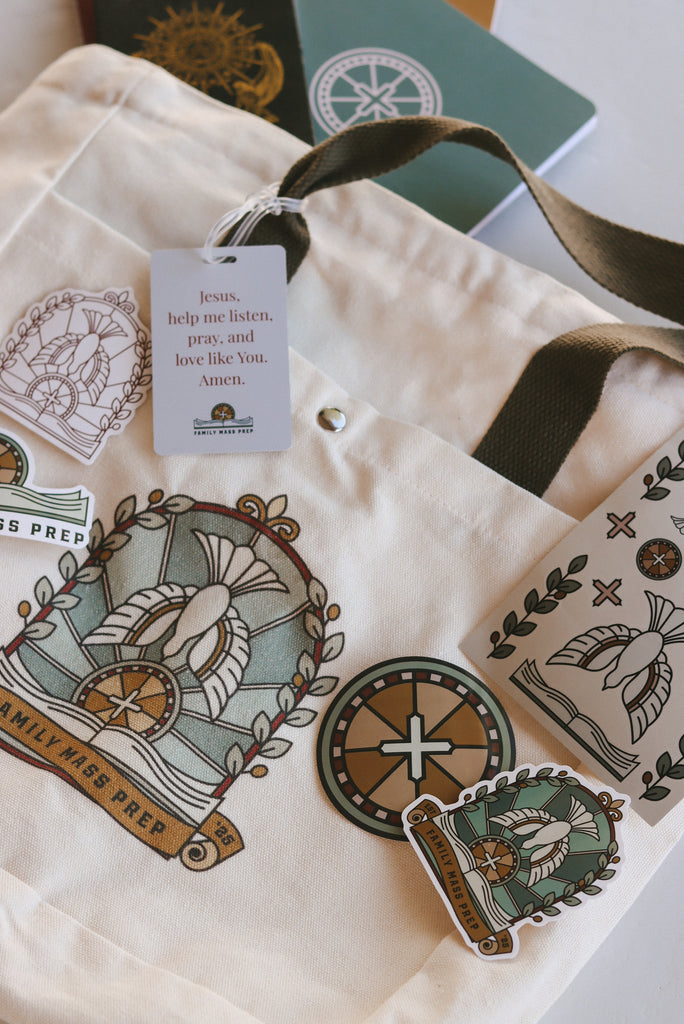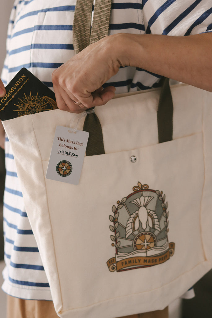 Sturdy Cotton Tote Bag – durable and made to hold everything from missals to snacks for little ones.