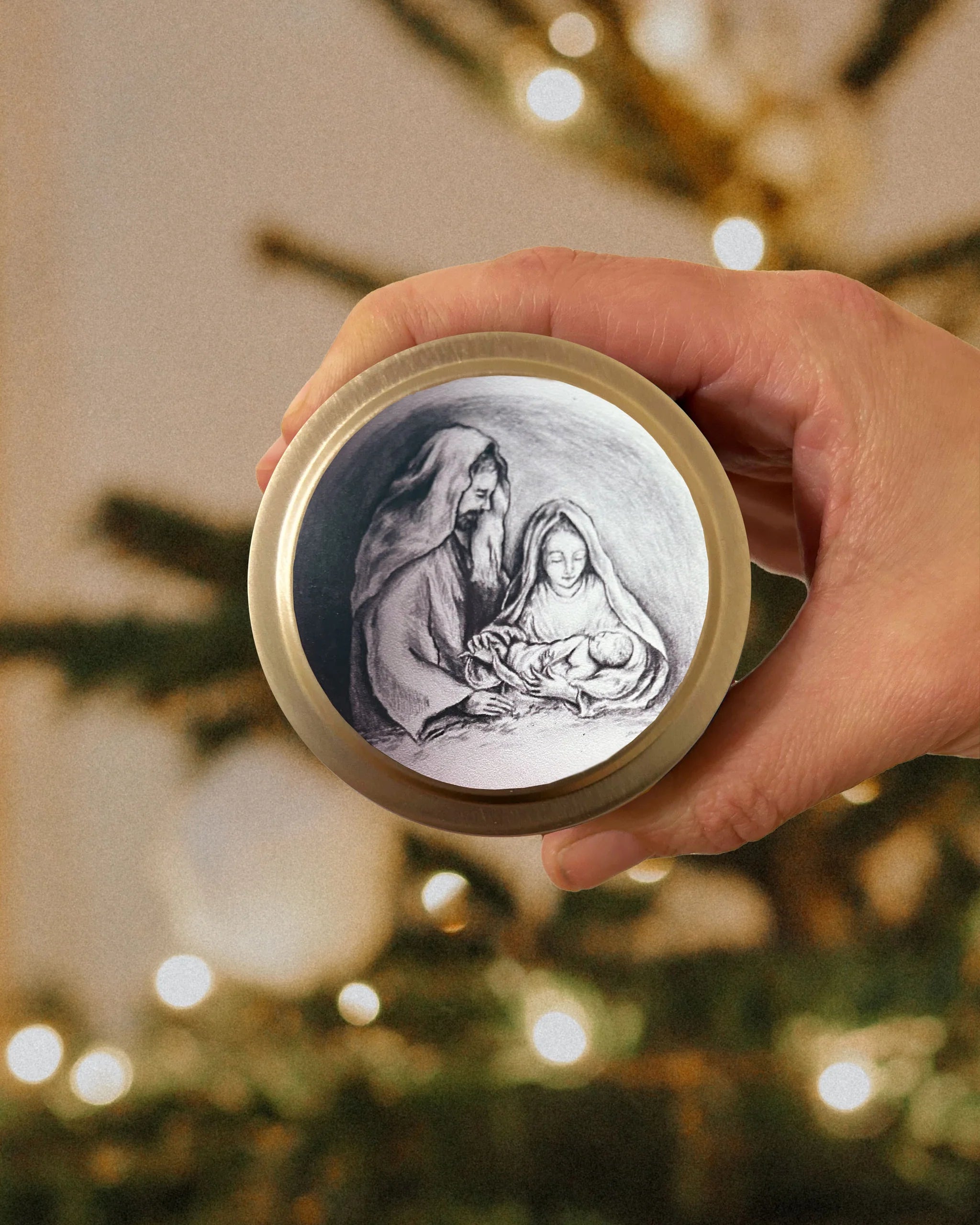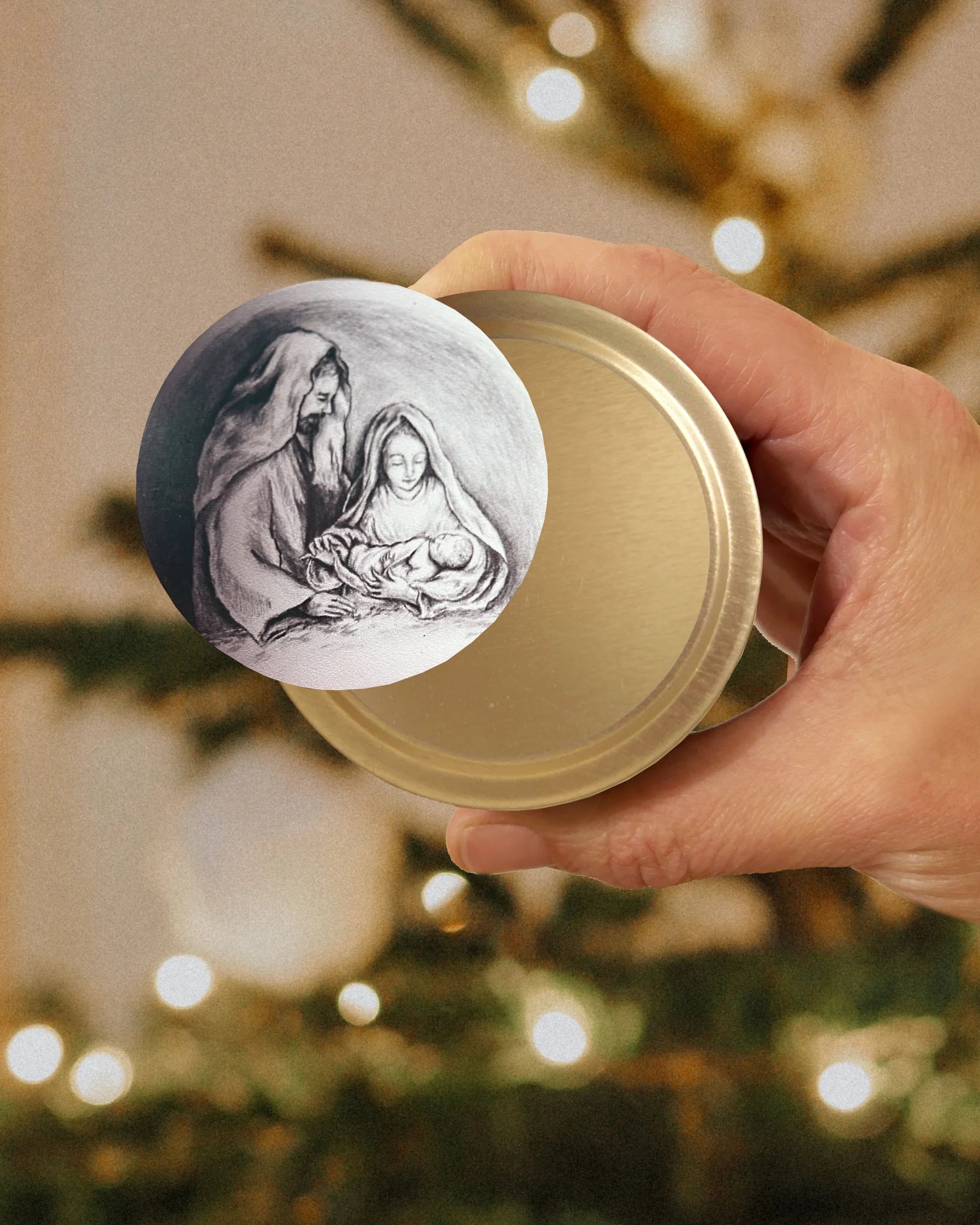 Holy Family Candle Gold Tin: Cranberry Orange Spice