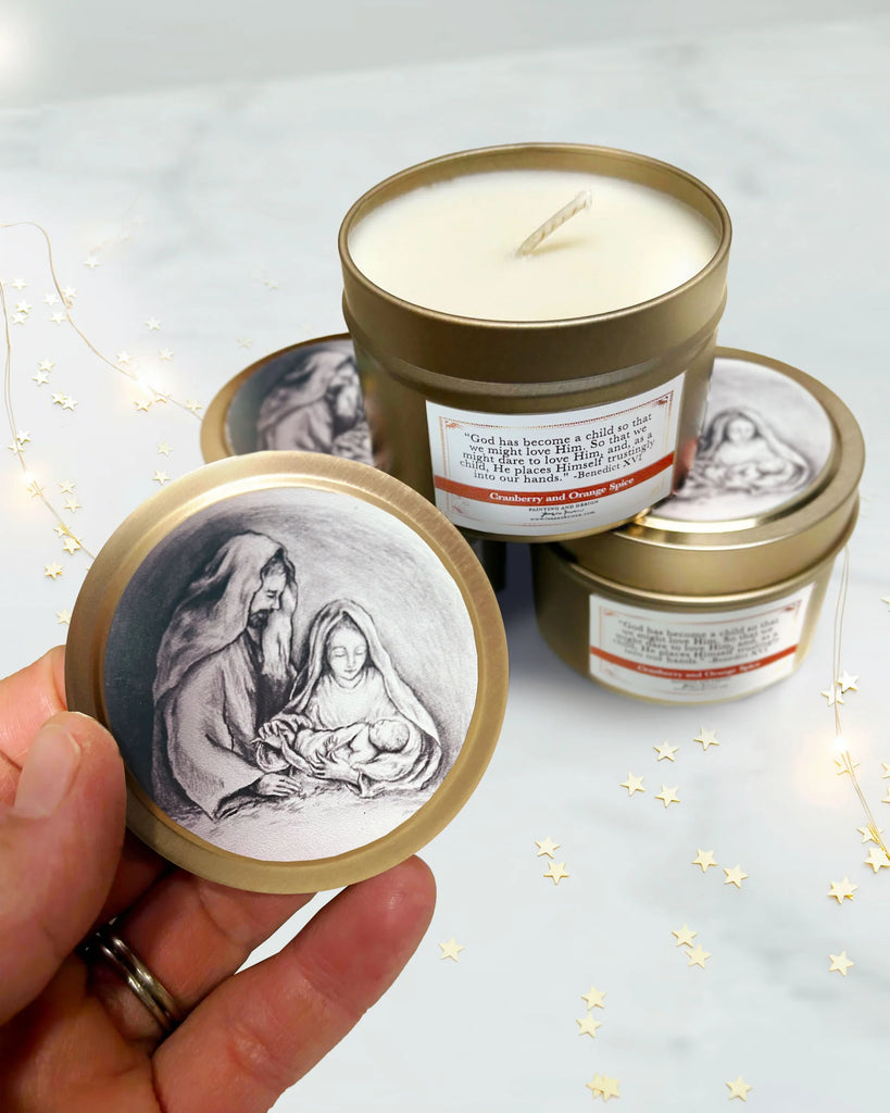 A perfect stocking stuffer, gift, or treat for the winter season. The orange, cranberry, and spice scent makes them incredible all season long! The candle can transform a room and yet has the beauty of the Holy Family.